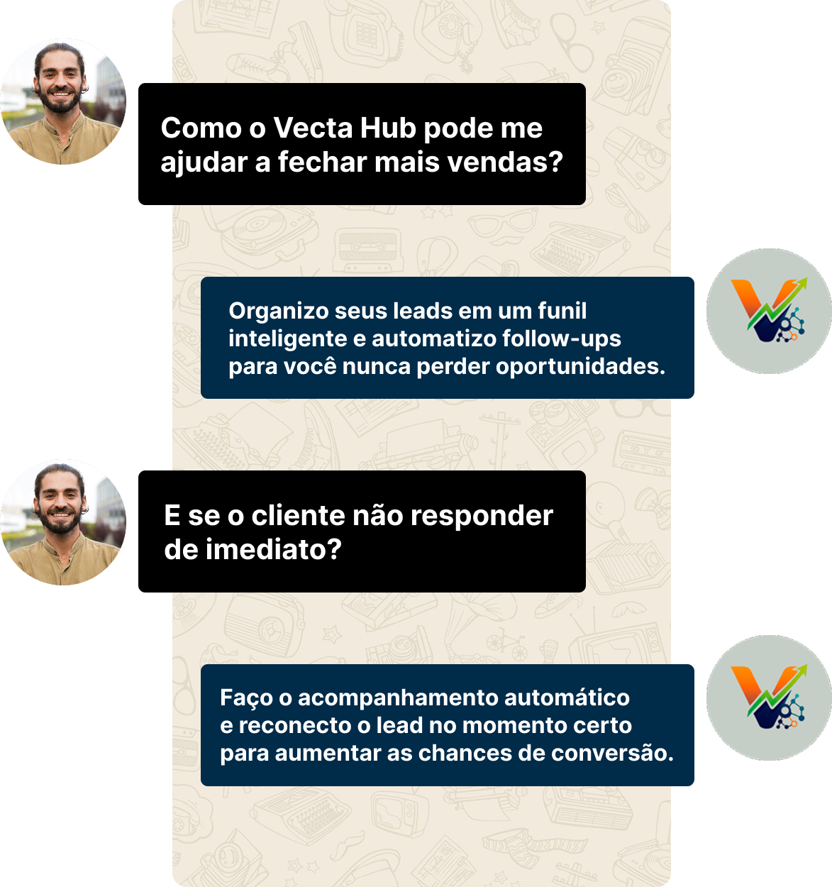 Com o CRM Vecta Hub, você nunca mais deixará oportunidades escaparem. Nossa plataforma organiza seu funil de vendas, automatiza interações e aumenta suas taxas de conversão com um fluxo de atendimento ágil e inteligente.